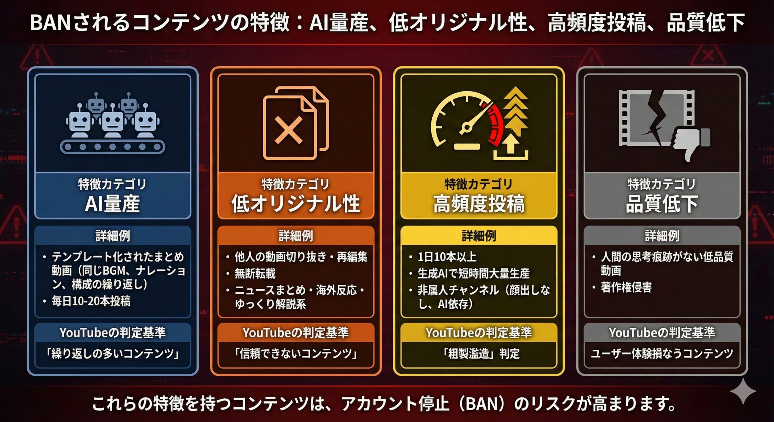 特に「切り抜き動画」「静止画スライド」「AI読み上げ」といったジャンルは、最も厳重な監視対象となっているようです。
